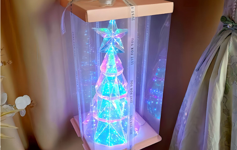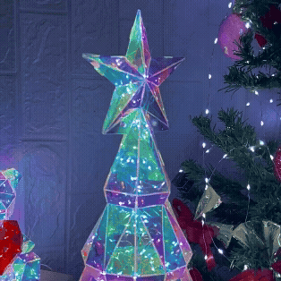 Specjalna konstrukcja z geometrycznych paneli odbija światło w tysiącach kierunków, tworząc hipnotyzujący efekt pryzmatu — jakby choinka była zbudowana z czystej tęczy.